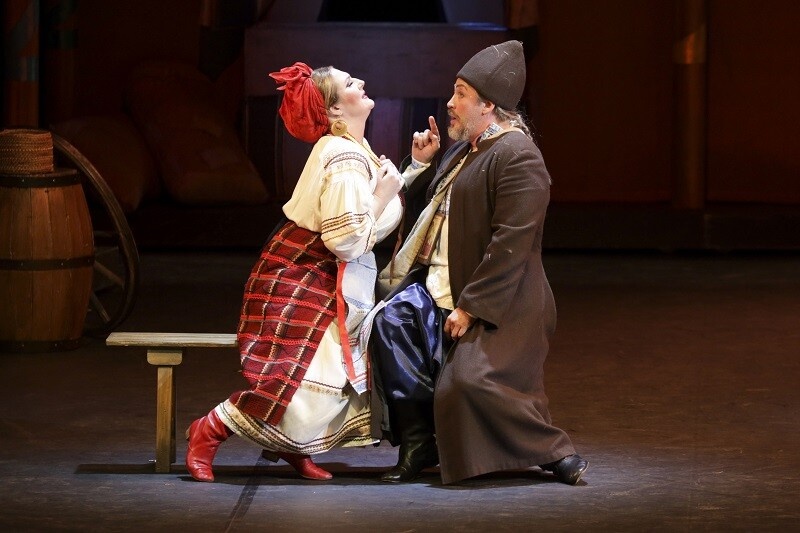 Перенос на большую сцену не повлек за собой изменений в певческом составе – спектакль на Новой сцене играется полностью солистами сцены Камерной. Их голоса и актерские индивидуальности совершенно не потерялись в новом объемном пространстве – абсолютно все звучат выразительно и ярко, играют с самоотдачей и драйвом. Впрочем, за семь лет, прошедших с присоединения КМТ к Большому, уже многие вокалисты бывшего Театра Покровского не раз выходили на Новую и даже Историческую сцены в небольших партиях, а некоторые даже и в ведущих, сумели освоиться с ними и доказать свою абсолютную состоятельность. Первый майский спектакль по составу исполнителей был идентичен осенней премьере: Черевик – Александр Маркеев, Хивря – Ольга Дейнека-Бостон, Парася – Екатерина Семёнова, Кум – Александр Полковников, Грицько – Александр Чернов, Афанасий Иванович – Игорь Янулайтис, Цыган / Чернобог – Азамат Цалити. Под водительством маэстро Алексея Верещагина они радовали красотой и харизматичностью своего пения, отличными ансамблями, в то время как оркестр выразительно живописал красоты «украинской» партитуры великого Мусоргского.