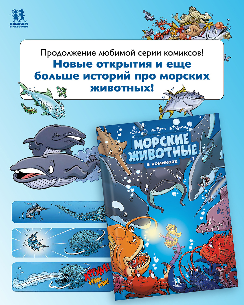 Встречайте новинку! Морские животные в комиксах. Том 7. Океан в деталях: вас ждут научные факты, юмор и тайны морских существ! Ещё больше странных, опасных и прекрасных созданий в продолжении любимой серии! Морские животные в комиксах. Том 7 Железные моллюски, прозрачные сальпы, скаты с их «дьявольскими кошельками», коварный флейторыл, древние акулы-долгожители и крабы, носящие «пальто» из ядовитых морских губок... А еще похожие на звездное небо павлиньи гаррупы и кальмары, мигающие до 4 раз в секунду! Вот лишь некоторые из множества героев очередного тома французской серии «Морские животные в комиксах». Да, океаны, моря и их побережья полны самых необычных животных, которых эволюция наградила удивительными способностями. Рыбы, моллюски, раки, акулы, киты, гагарки, тупики и многие другие жители водной и околоводной среды спешат рассказать о себе, своих соседях, друзьях... а то и врагах! Главной темой в этих рассказах становится какой-то аспект жизни животного: необычный адаптационный м