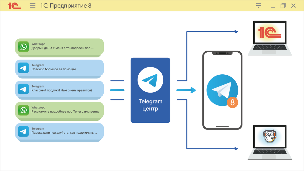Ссылка на сайт продукта: https://telefon.miko.ru/ Telegram центр - уникальная функция Панели телефонии для 1С компании МИКО, не имеющая аналогов. Telegram центр соберет новые входящие сообщения на WhatsApp или Telegram компании и доставит их в 1С, Панель телефонии для 1С и в мобильные телефоны сотрудников. Без дополнительных симкарт и приложений. Данные клиента не передаются сотрудникам. Telegram центр создаст в личном Telegram аккаунте менеджера чат-группу с клиентом. Теперь менеджер может общаться с клиентом с мобильного телефона, из 1С или Панели телефонии для 1С, все данные будут синхронизированы и сохранены в 1С. Как интеграция Telegram центр в 1С поможет бизнесу: 1. Клиент пишет в компанию на WhatsApp или Telegram компании. 2. Сообщение приходит на очередь сотрудников согласно входящей маршрутизации одновременно в 1С, Панель телефонии для 1С и Telegram центр. 3. Telegram центр создает группу со всеми менеджерами очереди со скрытым аккаунтом клиента в их личных аккаунтах Telegram