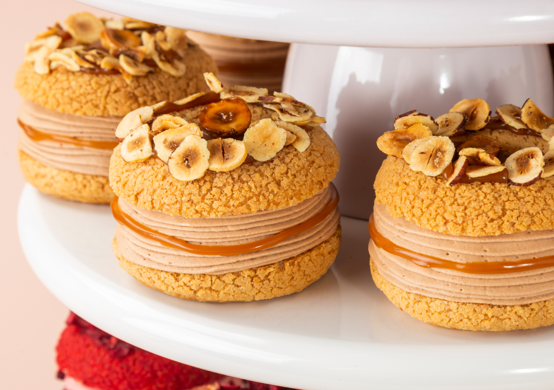 - В центр выложить заготовку из бананового кремю и взбитой карамели так, чтобы карамель была сверху.