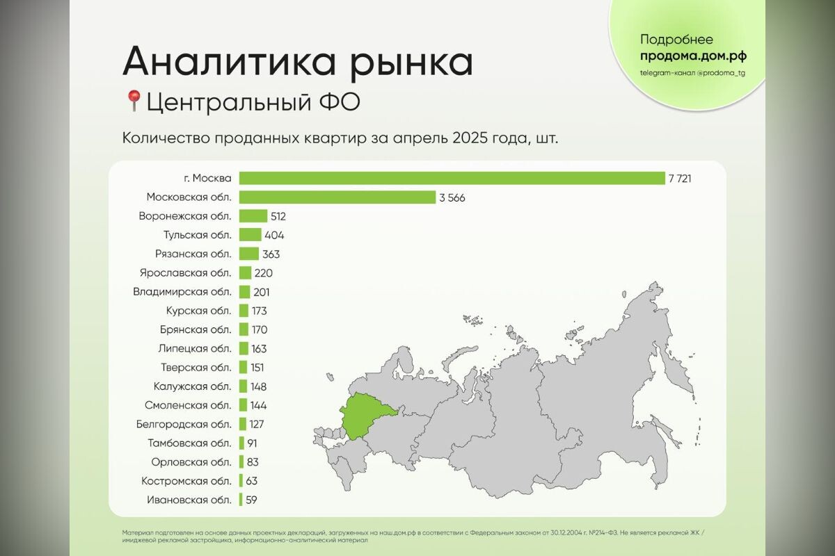 В апреле текущего года воронежские застройщики и риэлторы продали 512 квартир в новостройках. Об этом стало известно из опубликованного аналитического отчета сайта ДОМ.РФ. Воронеж занял третье место в ЦФО по продажам, уступив Москве (7721 проданная квартира) и Московской области (3566 квартир). Четвертое место досталось Тульской области — там реализовали 404 новые квартиры. А вот соседи Воронежской области по Черноземью показали куда более скромные результаты. Так, например, Курская область заняла 8-е место со 173 квартирами, Липецкая — 10-е (163 квартиры), Тамбовская — 15-е (91 квартира). Рейтинг замкнула Ивановская область — там всего лишь 59 продаж. Регион занял 18-е место.