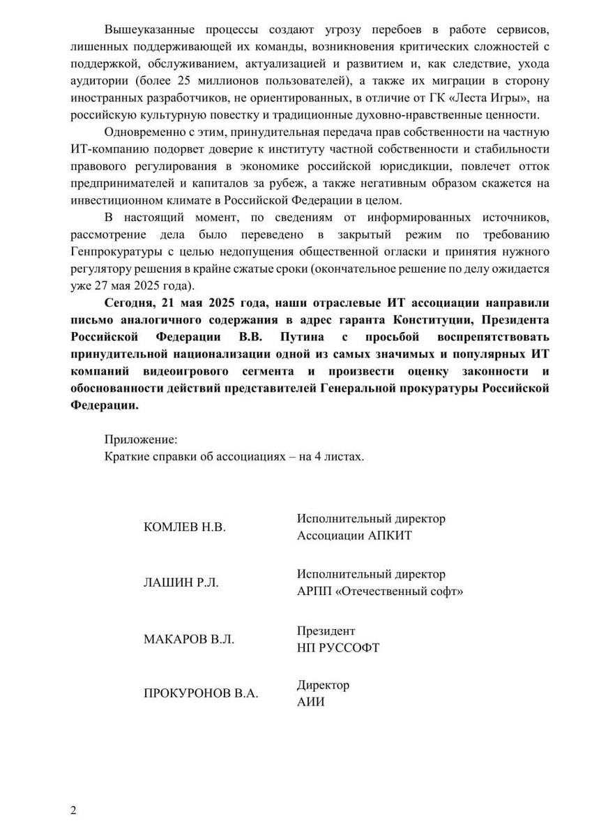 Сегодня, 21 мая 2025 года, наши отраслевые ИТ ассоциации направили письмо аналогичного содержания в адрес гаранта Конституции, Президента Российской Федерации В.В. Путина с просьбой воспрепятствовать принудительной национализации одной из самых значимых и популярных ИТ компаний видеоигрового сегмента и произвести оценку законности и обоснованности действий представителей Генеральной прокуратуры Российской Федерации.