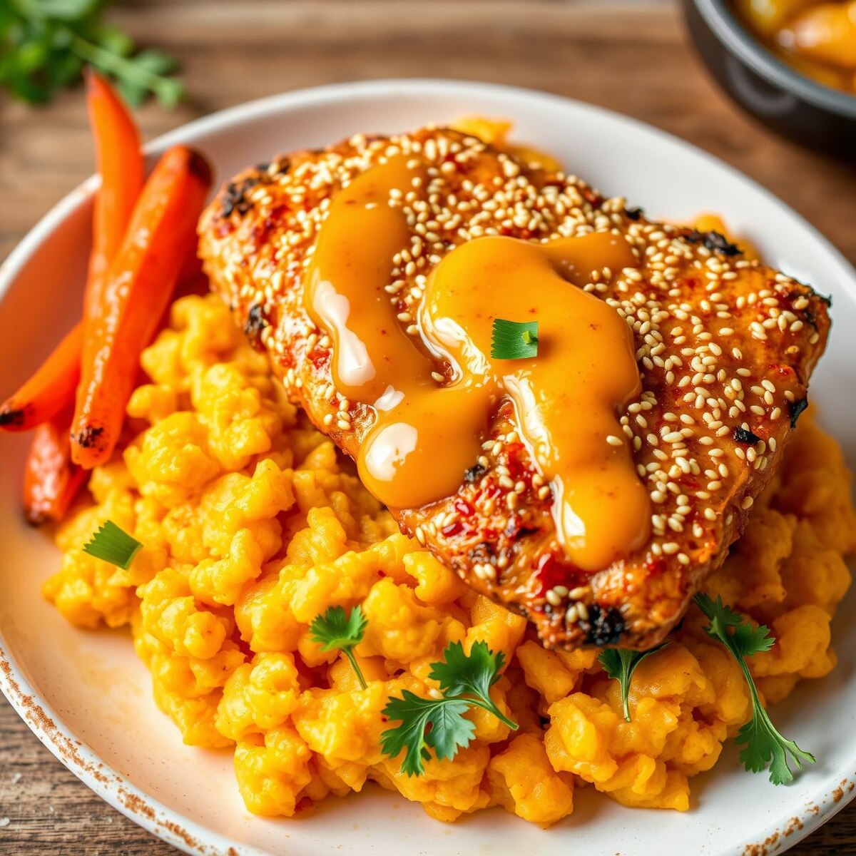 🍽 ТЁПЛЫЙ ОБЕД “СОЛНЕЧНЫЙ БАЛАНС”: КУРИНОЕ ФИЛЕ В КУНЖУТНОЙ КОРОЧКЕ С ПЮРЕ ИЗ ПЕЧЁНОЙ МОРКОВИ И СОУСОМ МАНГО-ЧИЛИ