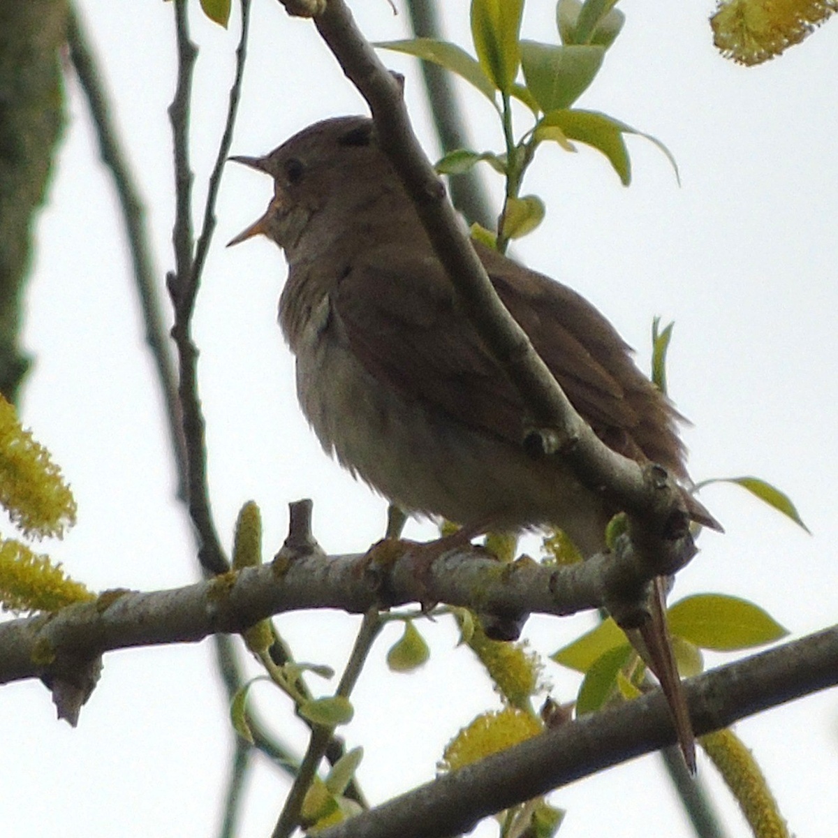 А это соловей наш, восточный, он же обыкновенный. Тоже поёт. Красивого наряда, как у варакушки, у него нет, но зато песня куда более разнообразная
