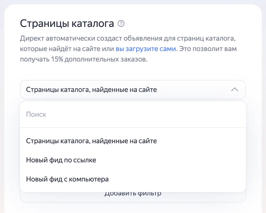 Если страницы каталога выключены, Директ создаст их автоматически для каталогов, товары из которых уже продвигаются в кампании.