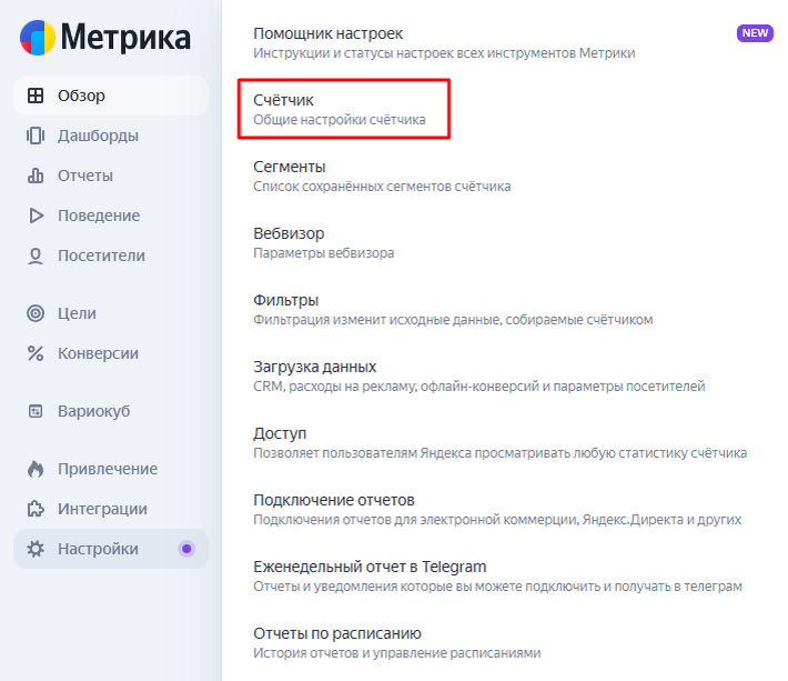 1. Заходим в раздел Метрики «Настройки» → «Счетчик».