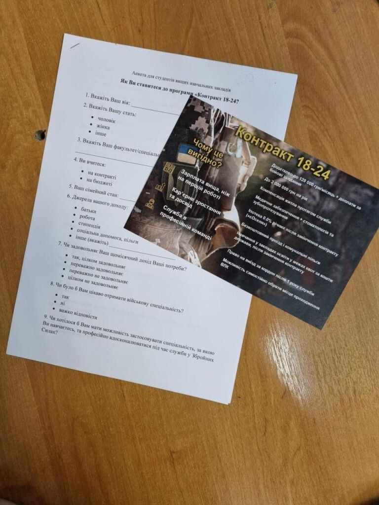 Анкеты содержат ряд вопросов, касающихся отношения студентов к военной службе, готовности подписать контракт с Вооружёнными силами Украины (ВСУ), а также оценивают личные и семейные обстоятельства. В частности, уточняется уровень дохода семьи и возможная реакция родителей на участие их ребёнка в боевых действиях. К опросу прилагаются информационные материалы, пропагандирующие преимущества контрактной службы.