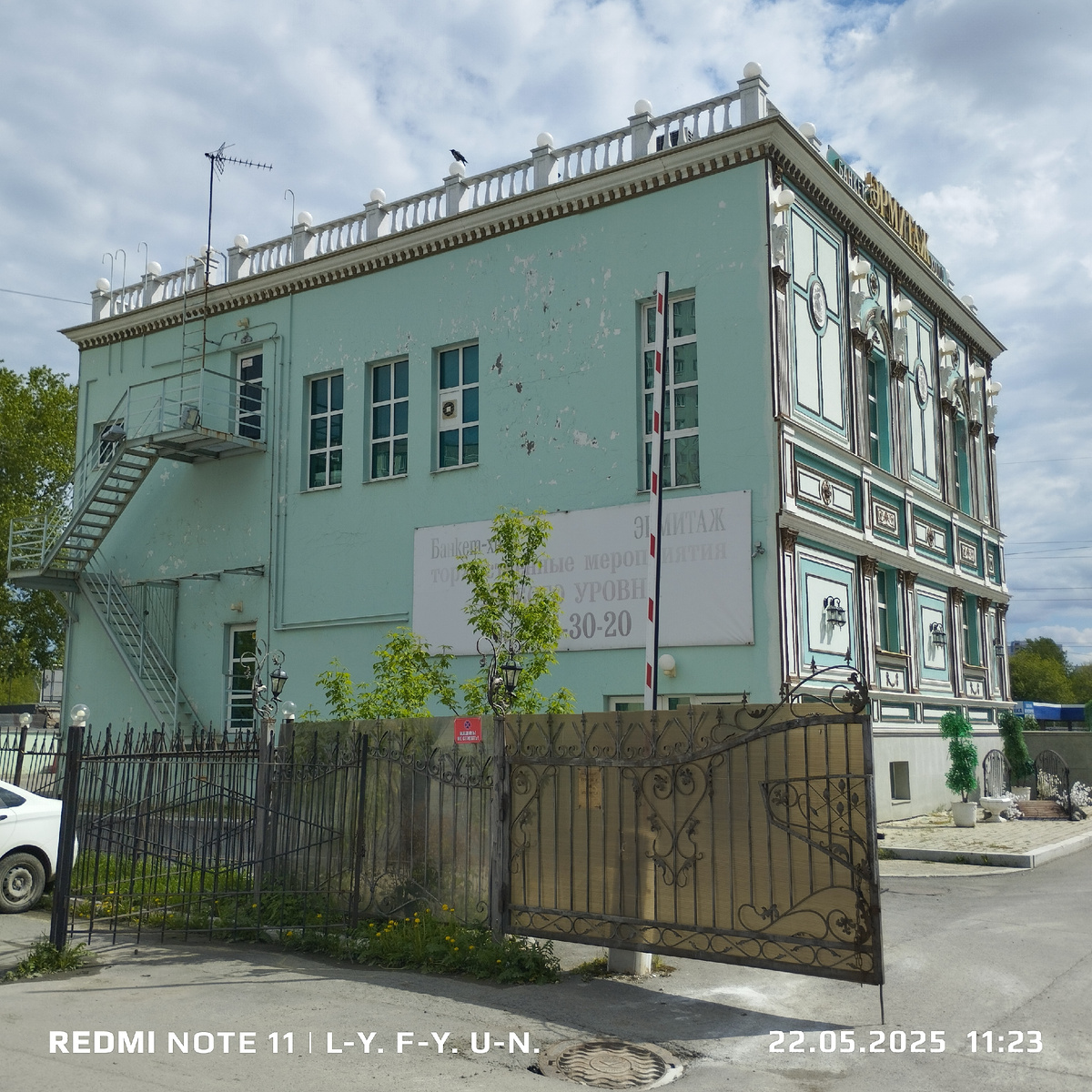 Впервые это здание мне показал инженер-конструктор Алексей, с которым мы вместе работали и сообщил что он на прошлой работе им занимался и здание принадлежит Азербайджанской диаспоре. Это полное вранье! ☝️Внутри никаких полумесяцев исламских нет, скорее католический христианский из древнего Рима с фресками совсем не православными. Поскольку сегодня у них будет проходить юбилей чьей то свадьбы, подготовили траурную арку через которую пройдут юбиляры, ну или торжественную арку "если крестьянин торжествует"😄