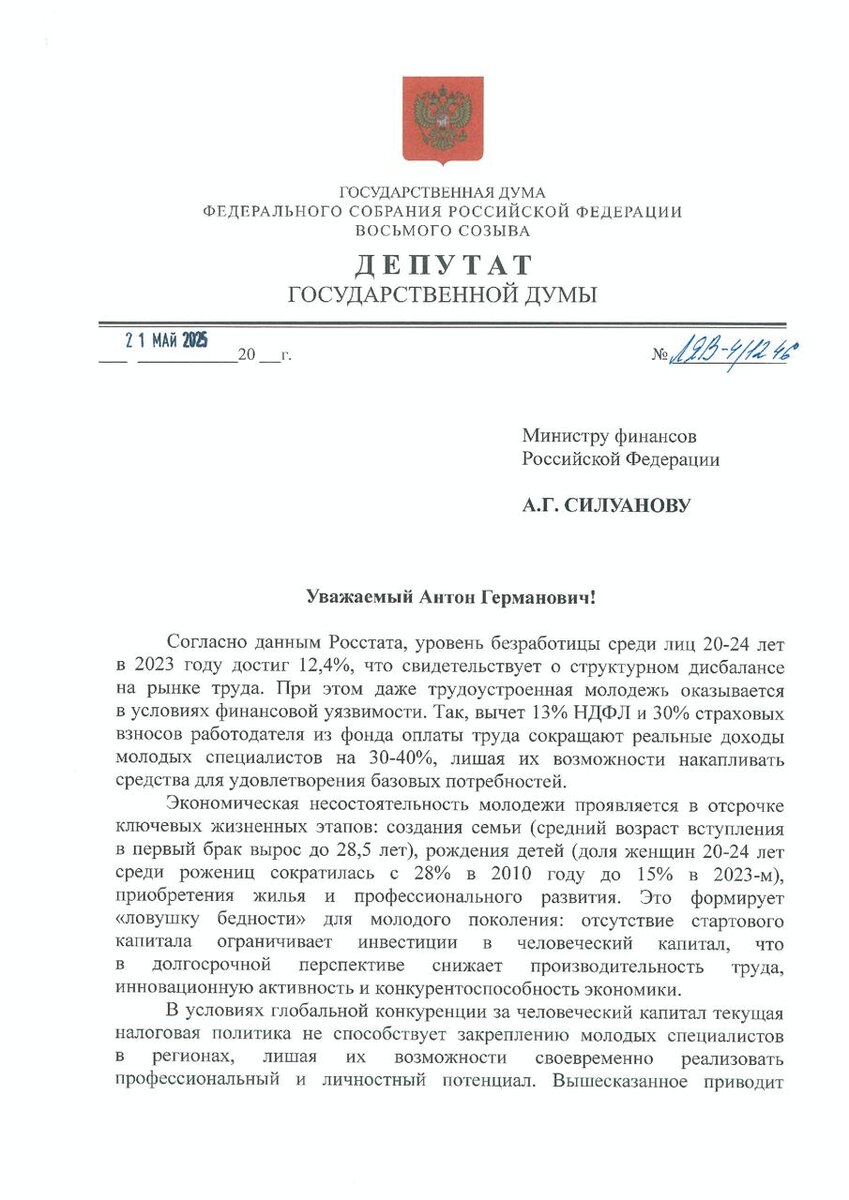 🎯 Молодёжи нужна поддержка — предложили снизить НДФЛ до 8% для граждан до 35 лет Сегодня вместе с руководителем фракции «Справедливая Россия — За правду» Сергеем Мироновым направили обращение министру финансов Антону Силуанову с предложением снизить налог на доходы физических лиц (НДФЛ) до 8% для молодых работников до 35 лет с невысокими доходами. 📊 Почему это необходимо? По данным Росстата, уровень безработицы среди молодёжи в возрасте 20–24 лет в 2023 году достиг тревожной отметки — 12,4%. Это говорит о серьёзных проблемах на рынке труда. Но даже те, кто работает, оказываются в сложной финансовой ситуации. Сейчас из зарплаты молодых специалистов вычитается 13% НДФЛ и ещё 30% страховых взносов от работодателя. В итоге реальные доходы сокращаются на 30–40%. 📌Это лишает молодёжь возможности накопить на базовые потребности: создание семьи, покупку жилья, рождение детей или получение дополнительного образования. Например, средний возраст вступления в брак вырос до 28,5 лет, а доля ж