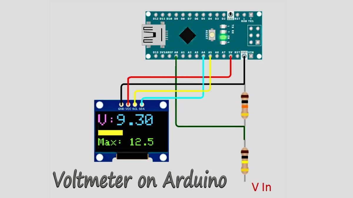 В этом проекте мы соберем простой цифровой вольтметр на базе Arduino Nano и OLED-дисплея (128×32 пикселя) и (128×64 пикселя) с интерфейсом I2C. Устройство умеет измерять напряжение в диапазоне до 5 напрямую и до 25 вольт с делителем на резисторах. И красиво отображать результат на дисплее с помощью текста и графики. Изменив резисторы диапазон измерений можно увеличить