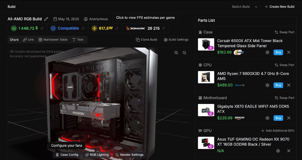 Собирать ПК — это кайф. Особенно если не надо открывать 10 вкладок, сверять сокеты и гадать, влезет ли видеокарта в корпус. Теперь всё стало проще: встречай BuildCores — онлайн-конструктор, который соберёт тебе сборку мечты, покажет, как она выглядит в 3D, и даже проверит, не напортачил ли ты. BuildCores — это бесплатный сервис для сборки компьютеров прямо в браузере, который: Как бы выглядел ПК моей мечты? BuildCores: «Вот так. И он помещается в твой бюджет.» 1. Визуальный конструктор в 3D 2. Полная проверка совместимости 3. Бенчмарки и аналитика 4. Экономия времени и денег Больше не нужно сравнивать цены вручную. Сервис подтягивает актуальные ценники с площадок и магазинов, чтобы ты не переплатил. 5. Поделись своей сборкой Сохрани ссылку, скинь другу или выложи в Discord — теперь твой сетап легко показать и обсудить. Сервис пока на пике популярности, и от наплыва пользователей сайт может немного тормозить или не загружаться. Но это временно — разраб
