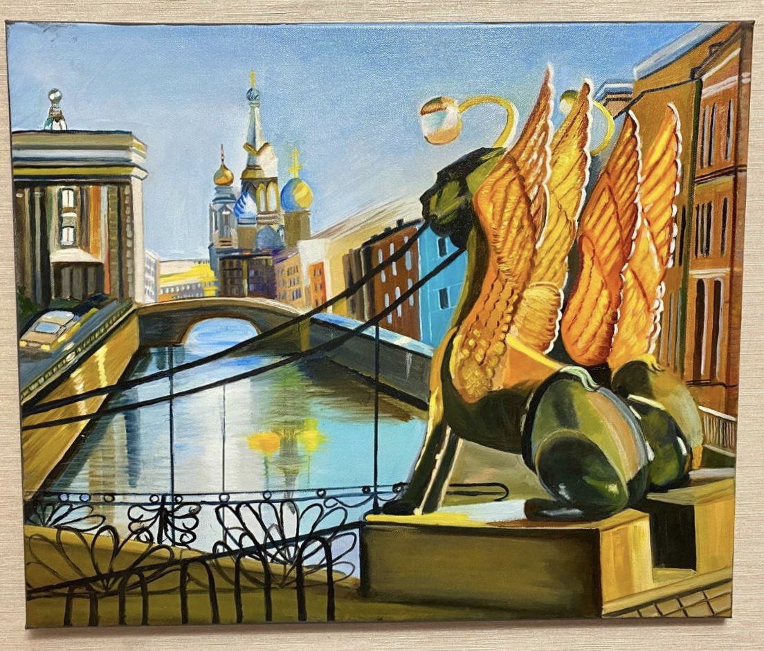 Златокрылые львы или Грифоны на Банковском мостике в Санкт-Петербурге. Холст хлопок, масло, 60*50 см