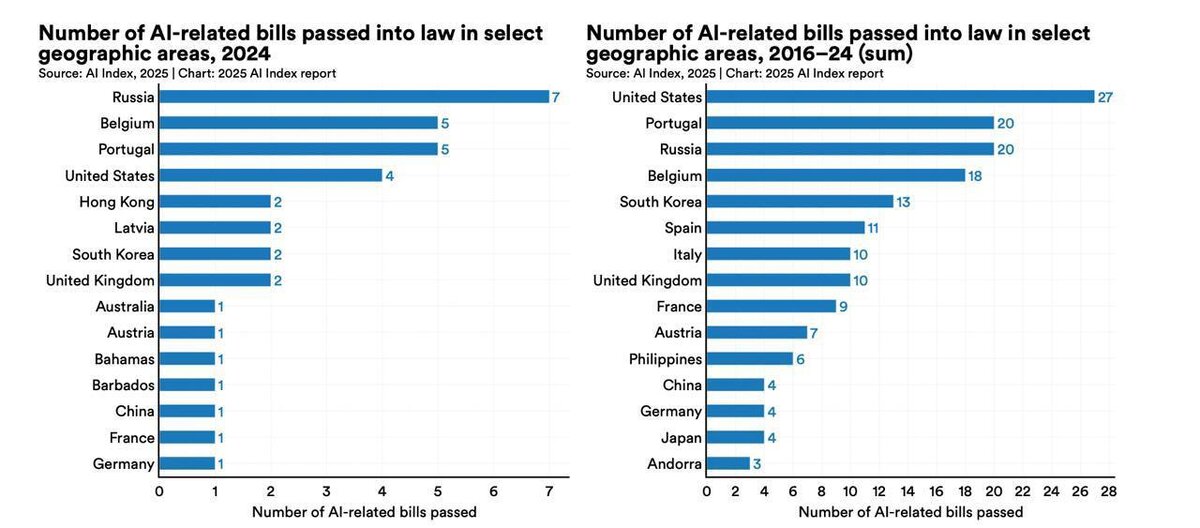 В апреле Стэнфордский институт ИИ представил новый Artificial Intelligence Index Report. Это один из самых авторитетных источников о глобальном развитии ИИ. Ключевые выводы: 📈Производительность ИИ на сложных задачах значительно возросла. 🏥ИИ активно внедряется в медицину, транспорт и бизнес: 78% компаний уже используют технологии. 💰Стоимость ИИ-систем снижается, а их доступность растет. 📜 В 2024 году было принято вдвое больше законов о регулировании, чем годом ранее. Кстати, Россия заняла по этому показателю 1 место (на инфографике). Конечно, лидером в разработке по-прежнему остается США, но Китай пытается сократить этот разрыв. Глядишь, и Россия когда-нибудь догонит. При этом венчурные инвестиции в ИИ-стартапы за 2024 год достигли рекордных $110 млрд, по данным Dealroom💪
