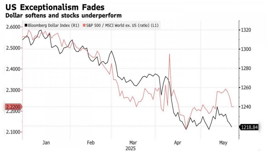 Если ранее доходность трежерис росла вместе с фондовыми индексами из-за сильной экономики и снижения рисков рецессии, то на исходе мая ситуация изменилась. Сначала снижение кредитного рейтинга США агентством Moody’s, а затем слабый аукцион по размещению 20-летних казначейских облигаций заставили инвесторов признать наличие проблем фискального характера. Лозунг «продай Америку» вспыхнул с новой силой, а падение доллара свидетельствует, что нерезиденты не горят желанием приобретать долги Штатов.…