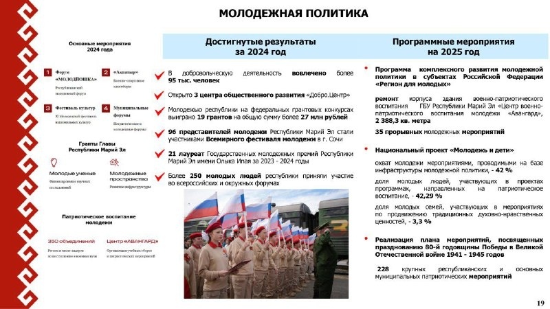 Марий Эл занимает второе место в России в своей подгруппе по итогам реализации молодёжной политики. В прошлом году завершился ремонт Дворца молодёжи, создали новое молодёжное пространство в Центре технического творчества Волжска, а 15 молодых учёных за три года получили 1,5 миллиона рублей на исследования. В республике развивается патриотическое и волонтёрское движение: 17 тысяч ребят занимаются в 350 патриотических организациях. Марий Эл входит в ТОП-10 регионов страны по поступлению юнармейцев в высшие военные учебные заведения и занимает 11-е место по удельному числу юнармейцев в стране.