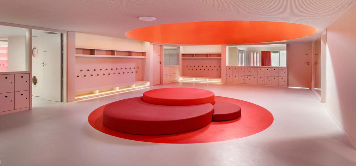Местная студия Dominique Coulon & Associés спроектировала в городке Илльзах в Эльзасе детский центр Multi-childcare Crèche, предназначенный для ухода за 50 детьми в возрасте от десяти недель до трех лет. Здание площадью 705 кв. метров окружено кленами, вишнями и японской спиреей, а его белоснежный фасад напоминает гигантскую скульптуру, гармонично вписывающую в городской пейзаж. Основание постройки оживает благодаря смелой палитре: насыщенные розовые и оранжевые тона выделяют входы, задавая игривый тон. «Динамичная цветовая гамма, обилие естественного света и пропорции здания позволили нам создать пространство, где чувствуют себя комфортно и дети, и сотрудники», — отмечает студия. Внутри цвет становится главным героем: просторный вестибюль, окрашенный в яркий вермильон, служит местом для встреч и прощаний, а также сценой для детских представлений и чтений.
