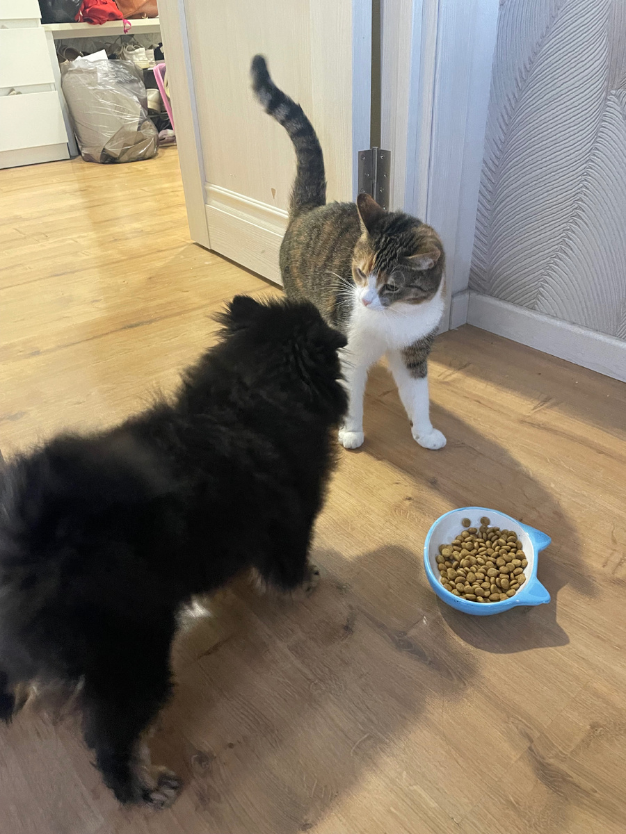 Бэлла скакала по квартире и хотела играть с кошкой. Кошка не хотела с ней играть. Она стерегла свой корм, чтобы собака не совала нос в ее миску 😅