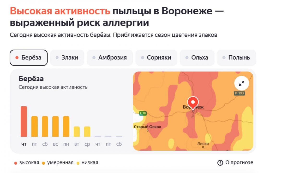 Аллергикам придется тяжело сегодня, ведь в Воронеже зафиксировали высокую активность пыльцы березы. Такие данные предоставил сервис "Яндекс Погода".