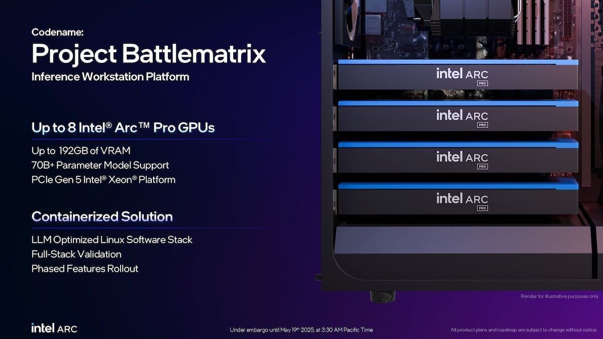 🔹 Для масштабных задач — Project Battlematrix : станции с 2–8 GPU B60 (до 192 ГБ VRAM), поддержка моделей с 70+ млрд параметров. Цена — от $5000 до $10 000.