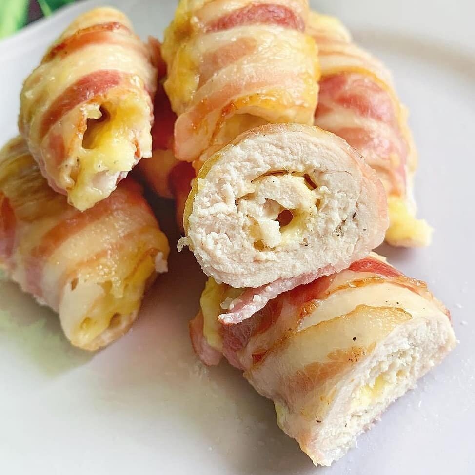 🔸Сыр натрите и положите на край файла немного тёртого сыра. Свернуть в рулет. Обернуть рулет полоской бекона.