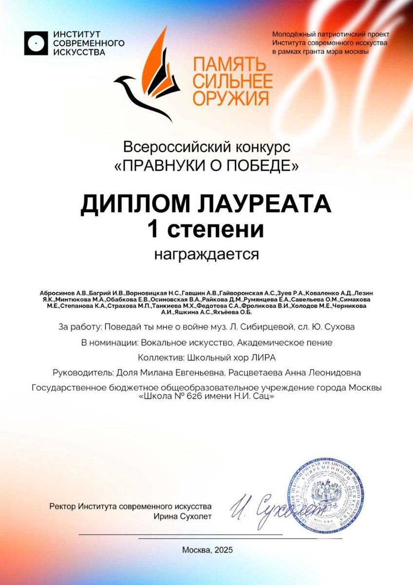 🎶 "Лира" - лауреаты Всероссийского конкурса! 🏆 Поздравляем всех участников школьного хора "Лира" с заслуженной победой! Ребята стали Лауреатами 1 степени во Всероссийском конкурсе "Правнуки о Победе"! 🥇 🎤 Это результат огромного труда и таланта наших юных вокалистов. 👩🏫 Отдельная благодарность руководителю хора, Милане Евгеньевне Доля, и концертмейстеру, Анне Леонидовне Расцветаевой! Именно благодаря их профессионализму и преданности делу "Лира" не первый год радует нас своими успехами. 👏 ⭐️ Желаем хору "Лира" дальнейших творческих побед и вдохновения! 🎶 Вы - наша гордость! ❤️ #ДОНМ #ТалантливыеДетиМосквы #школа626 #школасац #котловка #мрсд23
