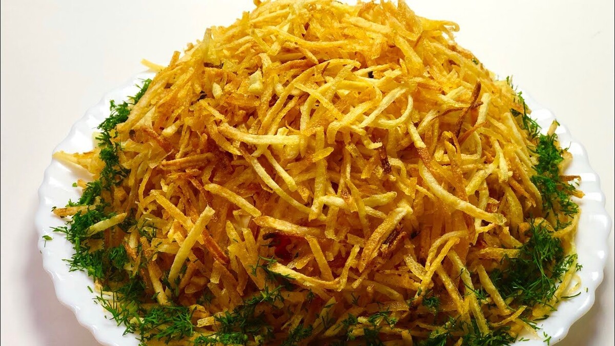 - Сверху обильно посыпать картофельной соломкой, чтобы она покрывала весь салат.