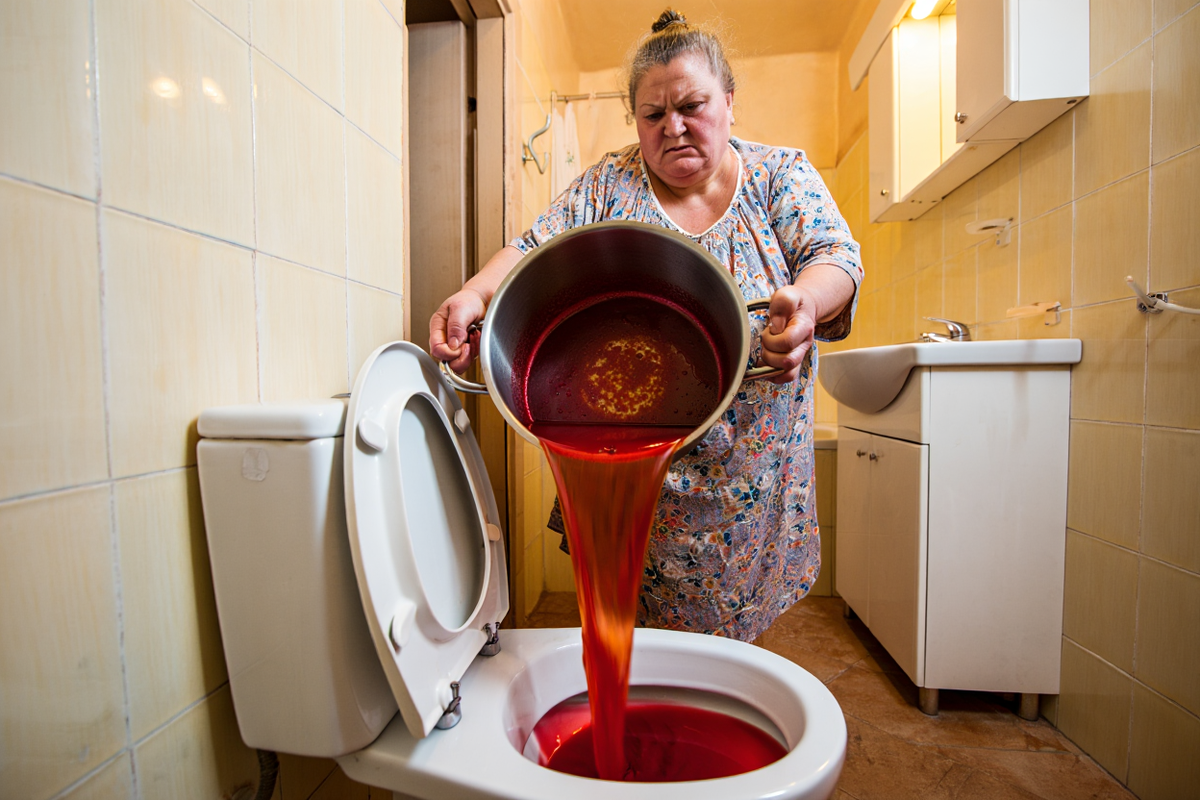 Щёлк! — дверь ванной. Все, как приклеенные, глядят в одну точку. Тамара Павловна открывает крышку унитаза и, медленно выливая борщ, говорит хрипловато, с металлической ноткой: