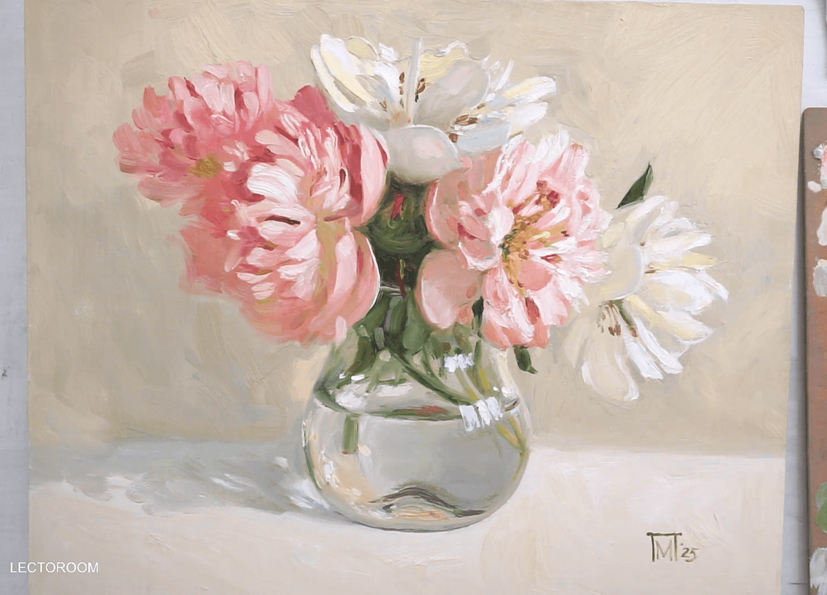 Это про то, как выйти за рамки схемы. Про то, как смотреть на цветок и видеть не «розовый шарик», а дыхание. Свет. Движение. Мария Павлова — художник, которая не боится обрезать, дорисовать, изменять. И в этом вся суть урока: живопись — не про точность, а про выразительность. На первый взгляд задача простая: композиция с пионами, стеклянной вазой и мягким светом. Но уже в первой части мастер-класса становится ясно — важно всё: