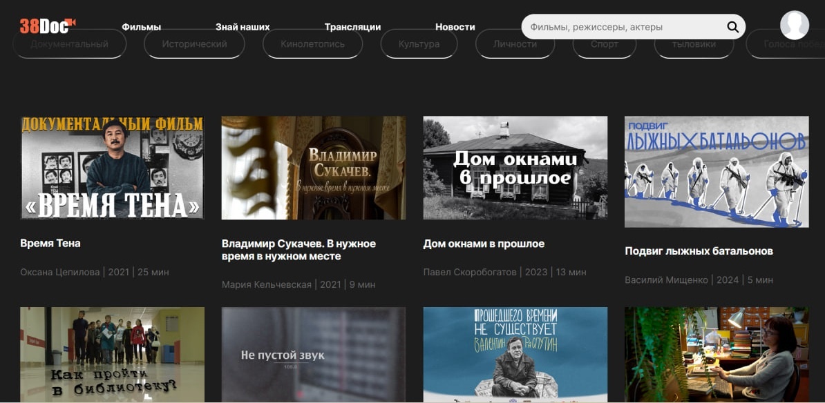 В Иркутской области создан первый в Сибири онлайн-кинотеатр 38doc.ru, где можно увидеть работы сибирских режиссеров Анастасии Зверьковой, Баяра Барадиева, Юрия Яшникова, Марии Кельчевской, Василия Мищенко, Павла Скоробогатова, Юрия Немерова, Оксаны Цепиловой, Полины Степановой, Юлии Бывшевой, Дмитрия Слободчикова, Николая Тарханова, Андрея Юдина, Алексея Лагерева и других.
