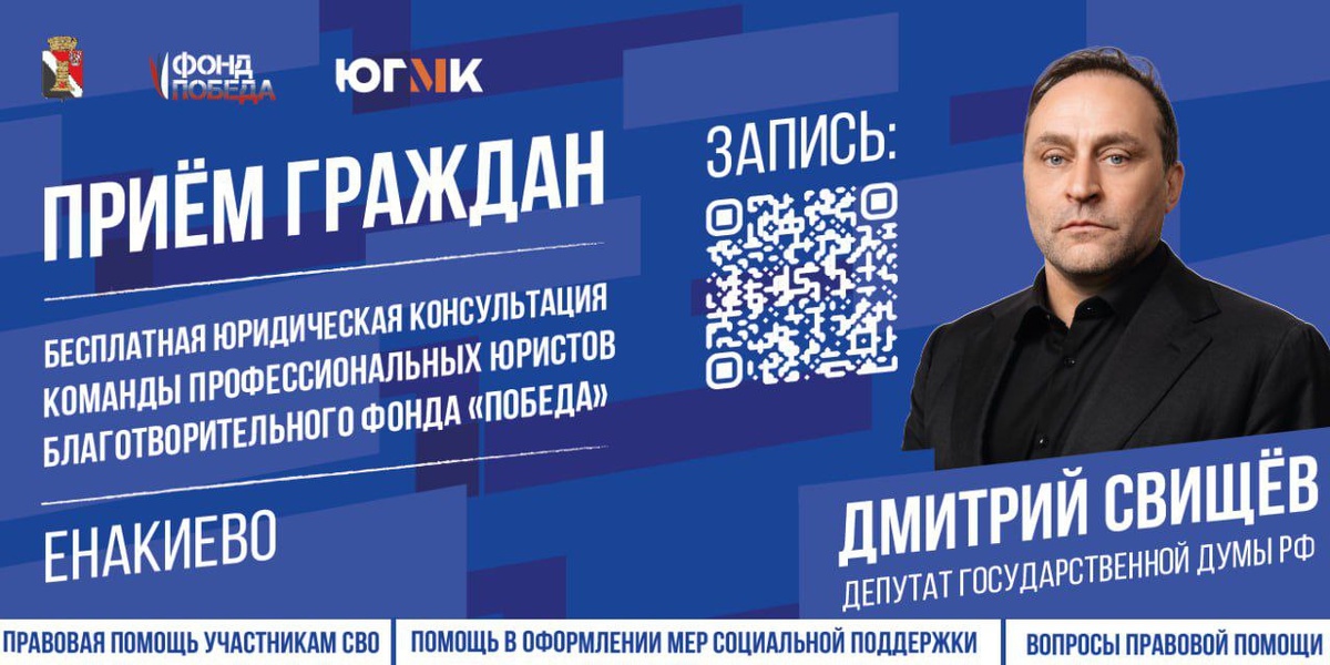 В рамках Всероссийского приема граждан ЛДПР и Благотворительный фонд «Победа», организовывают бесплатную выездную консультацию юристов в г. Енакиево. Партия оказывает всестороннюю поддержку участникам СВО и жителям Донбасса, поэтому для решения сложных и насущных проблем, связанных с юридическими вопросами, была запланирована данная поездка. По каким вопросам будет оказываться консультация: - вопросы СВО (несправедливого отношения, невозможности установить статус участника, ветерана, отсутствие выплат семьям, поиск пропавших, квартирные вопросы, реабилитация, выплаты за ранения, награды, получение земельных участков, налоговые льготы, бесплатная регистрация бизнеса); - вопросы жилья (для беженцев, восстановление жилья пострадавшего после обстрелов, получение компенсаций за пострадавшее или утраченное жилье, жилье для многодетных и сирот, внесение данных в росреестр); - правовые отношения с жилищными компаниями; - вопросы пенсионных начислений, получение пенсий (для граждан с трудовым