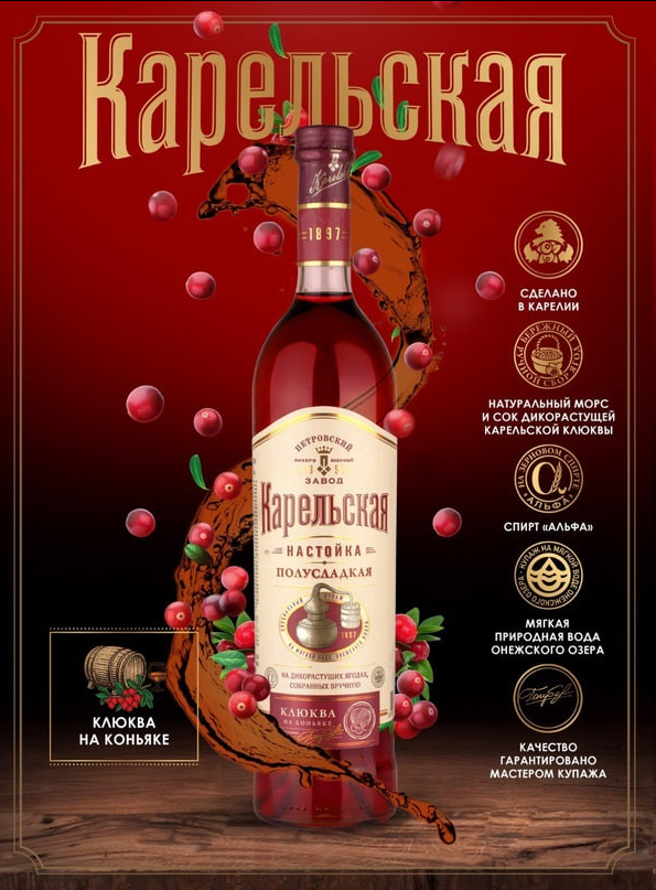 Всем привет от меня, КОньячного Маньяка и наших друзей! Очередная настойка на коньяка, но, слава тебе Бахус, нормальной крепости! Настойка полусладкая (я думал это винный термин), исключительно с соком и морсом северных ягод, собранных вручную в ЗАПОВЕДНЫХ районах Карелии, водой Онежского озера, спиртом Альфа и прочие ля-ля тополя... Состав: вода, спирт Альфа, сахар, клюквенный спиртованный морс, сок клюквенный, коньяк (коньячный дистиллят выдержанный, вода, сироп, колер), настой спиртованный вишнёвого листа, настой липового цвета. Крепость 38%. Впечатляет! Производитель ООО Алковорд, Карелия, Петрозаводск. Цвет коньяка с вишней. Аромат дохлый. Что то там ординарочно-коньячное, практически неразборчивое, дуб, чуть специй. Спирта нет. Клюквы, либо какой нибудь другой ягоды - НЕТ! Фруктов -нет. Ни фига лысого нет! Улучшенный чем то не понять чем запах ординарки. Точка. Вкус чуть получше, но не более того. Коньяк, ординарный, жгучий коньяк, даже чуть перехвативший горло. Но не спиртуозны