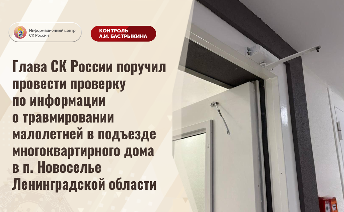 Глава СК России поручил провести проверку по информации о травмировании малолетней в подъезде многоквартирного дома в п. Новоселье Ленинградской области Внимание Председателя СК России А.И. Бастрыкина обращено на публикации в СМИ и социальной сети о травмировании десятилетней девочки в поселке Новоселье Ленинградской области. В мае текущего года из-за неисправности доводчика в подъезде малолетняя получила удар дверью по руке. Пострадавшей потребовалась медицинская помощь, у нее диагностированы переломы. Отмечается, что до настоящего времени сотрудниками управляющей компании меры к устранению нарушений не приняты. Председатель Следственного комитета Российской Федерации Александр Иванович Бастрыкин поручил и.о. руководителя СУ СК России по Ленинградской области Дмитрию Юрьевичу Митяеву провести процессуальную проверку и доложить об установленных в ходе первоначальных проверочных мероприятий обстоятельствах, а по завершении процессуальной проверки – о ее результатах. Исполнение поручения