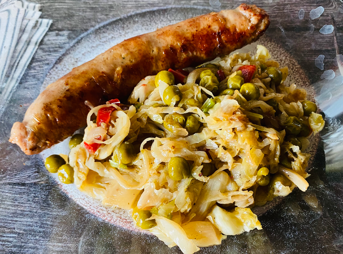 Выкладываем капусту на блюдо, и на той же сковороде жарим колбаски до румяной корочки на среднем огне.