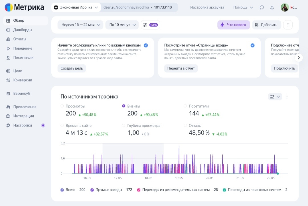 Прошло около 10 дней, и я наконец получила немного информации о вас, мои дорогие читатели! У меня стоят стандартные, "заводские" настройки, в глубь пока не лезла. Слева самая верхняя кнопка "Обзор" даёт информацию по количеству посетителей за указанный период времени. Здесь можно посмотреть, откуда приходят читатели: - прямые заходы 172 - из рекомендаций 26 - из поисковых систем 2 Хотелось бы больше заходов из поисковых систем, но для этого нужно заниматься SEO-оптимизацией заголовков. Этот метод я применила пока только к двум статьям про мангал и подарки. Здесь можно посмотреть соотношение новых посетителей и вернувшихся. Постоянных читателей у меня как раз около 28, и 129 новых, это приятно, если бы ни одно но: 122 посетителя посчитали мою страницу не интересной, и ретировались. Очень обидно и не понятна причина. Возможно описание канала не цепляет, или название канала не соответствует содержанию. Попробую что-нибудь поменять. Основные графики и цифры получаю через кнопку "отчёты" с