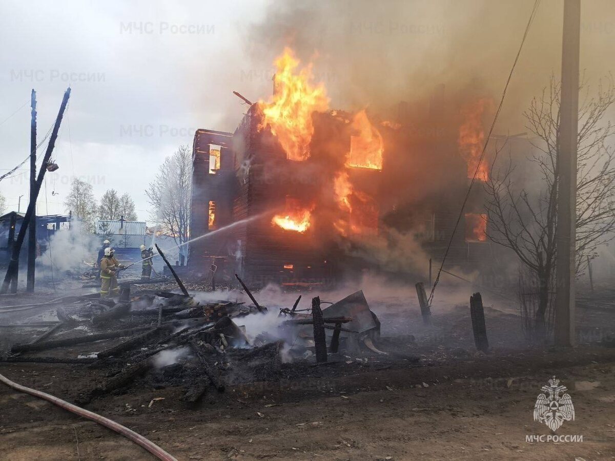 📍Место пожара - с. Емецк, Архангельская обл. Горят три частных жилых дома и хозяйственные постройки.