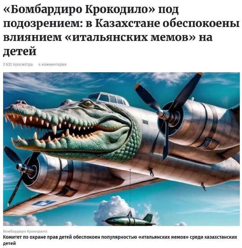 Бомбардиро Крокодило могут запретить в Казахстане — брейнрот-мем обвинили в религиозных отсылках и намёках на войны Внимание: родители уверены, что Бомбардиро «бомбит детей в Газе» и «не верит в Аллаха и любит бомбы». Они жалуются, что мем приводит к агрессии, тревоге и разрушает ценности Тралалело Тралала выиграл даже эту битву @Escape