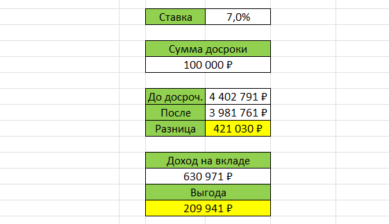 Я это сделал, и я получилось, что к окончанию выплаты ипотеки, на моем счете в банке будет 630 971 рублей. Это больше, чем если бы мы внесли досрочный платеж. И разница составляет 209 941 рубль. Вот такие результаты.