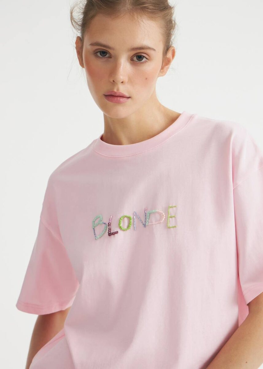 В Lime Пеппа увидела футболки с вышивкой из бисера Мы же понимаем, что это отсылки к нашумевшему треку, под который Билли Айлиш в том числе, записала рилс в запрещенной сети “…Блонды и гламур, и брюнетки…” И найденные футболки натолкнули на мысль Свинку сделать вышивку самостоятельно на футболке, запасы остатков бисера вполне сгодятся