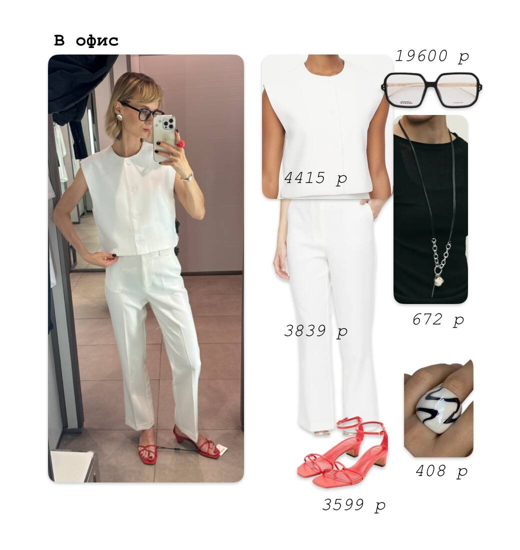 Собрала для вас 4 готовых образа под разные случаи. В этот раз добавила к коллажам дополнительные позиции по аксессуарам и цены - надеюсь так вам будет удобно и полезно. Недавно я заглянула в Maag и собрала для вас четыре готовых образа под разные случаи жизни. Все вещи доступны online, а к коллажам я добавила аксессуары и актуальные цены — чтобы вам было проще представить, как это можно собрать под свой бюджет. Посмотреть образы в движении можете здесь Белый жилет 4415 ₽ + брюки в тон 3839 ₽. Акценты: украшение на шею 672 ₽, кольцо 408 ₽, очки: бюджетные 576 ₽ или дизайнерские 19 600 ₽. На ноги — красные босоножки 3599 ₽ (очень рекомендую — и удобные, и эффектные). Жакет с коротким рукавом 6719 ₽ + брюки 3839 ₽ + компактная сумка 2880 ₽. И снова — красные босоножки здесь. Юбка-баллон 4799 ₽ + кардиган макраме 6719 ₽. Сумка из натуральной кожи 13 990 ₽, украшение на шею 672 ₽, те же босоножки — как универсальная база. Розовая юбка 2687 ₽ + джемпер с коротким рукавом 1535 ₽. Добавила л