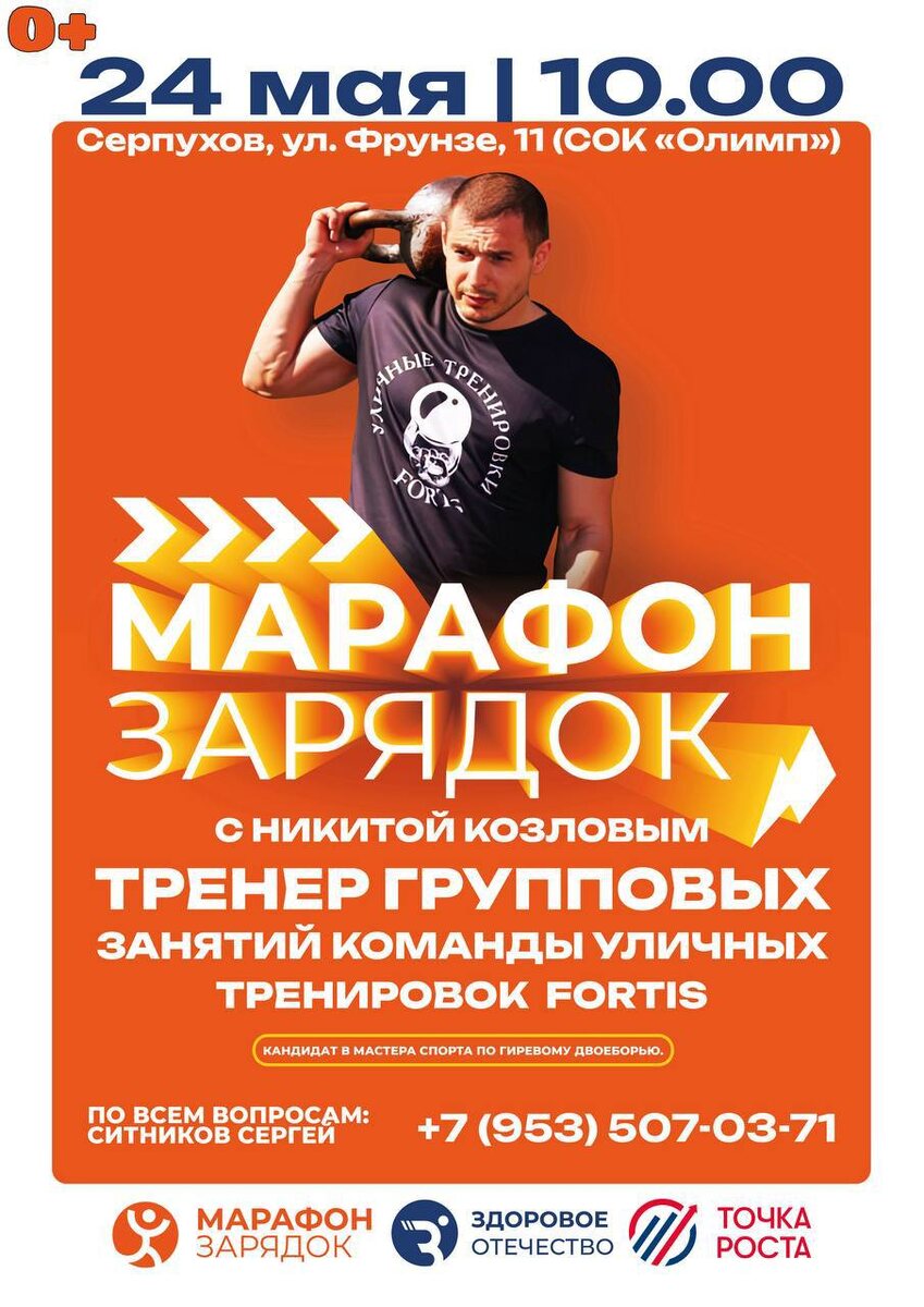 💪🏻24 мая в 10:00 пройдёт еженедельный «Марафон Зарядок», инициатором которого является Всероссийское общественное движение «Здоровое Отечество»! 🎗️Цель проекта «Марафон Зарядок» заключается в популяризации здорового образа жизни и физической активности среди жителей г.о. Серпухов! 🤝🏻Уже в эту субботу в 10:00 зарядку проведет тренер групповых занятий команды уличных тренировок Fortis! 📍Организаторы ждут каждого по адресу г.Серпухов, ул. Фрунзе, 11 (COK «Олимп»)!