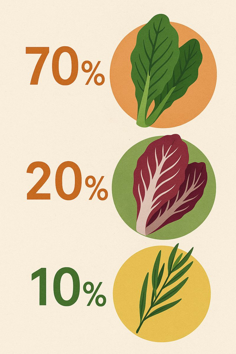 Спустя много лет я пришла к простой схеме, в которой салат перестаёт быть «зелёной мешаниной» и листья попадают в миску по плану, а не «чем богаты, тем и рады». Смысл — не набить миску пятью видами трав, а выбрать минимум зелени, который перекроет сразу вкус, текстуру и аромат. Формула 70‑20‑10 70 % — база‑носитель Категория: Супермаркетные. хиты Примеры: айсберг или ромэн для четкого хруста; молодой шпинат для бархатной текстуры. Он даёт объём, удерживает соус и не спорит с другими ингредиентами. 20 % — акцент‑характер Категория: Горькая зеленуха или листовые овощи Примеры: руккола или радиккьо, если нужна яркая горчинка; молодая свекольная ботва, если хочется сладковатого хруста, щавель если кислинки. 10 % — аромат‑штрих Категория: Травы‑специи или дикоросы/редкая экзотика. Примеры: сильная трава, которую чувствуешь носом раньше, чем вилкой. Базилик, кинза, мята, укроп, тархун, шисо, лимонная вербена. Всего щепотка — и блюдо запоминается. Мои рабочие сочетания по формуле 70‑20‑10: 1.