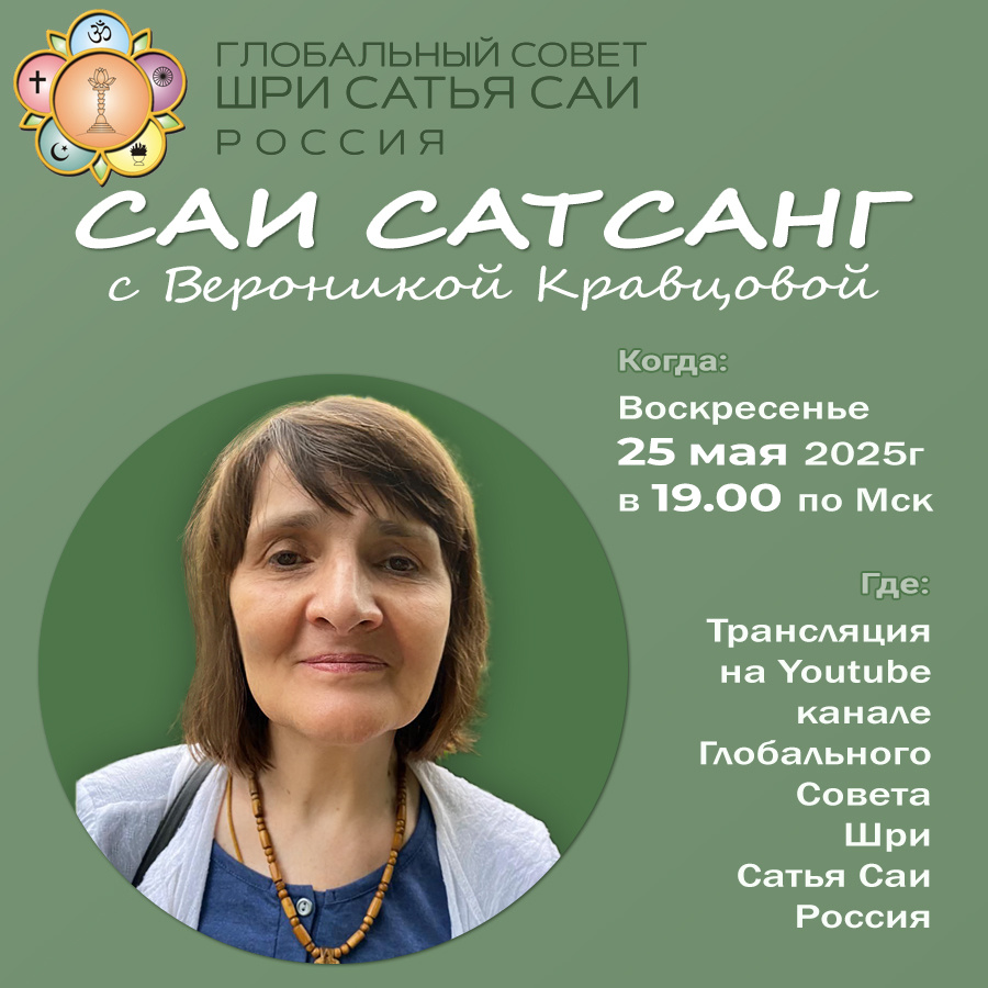 Саи-сатсанг с Вероникой Кравцовой Когда: 25 мая 2025 г. в 19.00 по Мск (воскресенье) Где: трансляция на Youtube канале Глобального Совета Шри Сатья Саи Россия: https://youtube.com/@sssgcrussia Вероника Кравцова является Саи преданной более 25-ти лет. По Милости Багавана была переводчиком на Его интервью с группой русскоязычных преданных. С 2005 г. совершает регулярные паломничества в Прашанти Нилаям и выполняет переводческую севу. Была переводчиком на многих сатсангах старых преданных Бхагавана: проф. Анил Кумар, Шьям Сундарам (секретарь Бхагавана), доктор Сарапаван (один из врачей Саи Госпиталя), Нушин Мехрабани (автор книги "Любовь и страдание»), Шри Мата Джи Кумарама и др. В течение ряда лет была одной из переводчиков журнала "Санатана Саратхи". Переводчик книги Шриджит Нараяна "Саи, да приидет Царствие Твоё!". На сатсанге Вероника поделится своими воспоминаниями о Бхагаване Шри Сатья Саи Бабе, а также расскажет о своей переводческой севе.