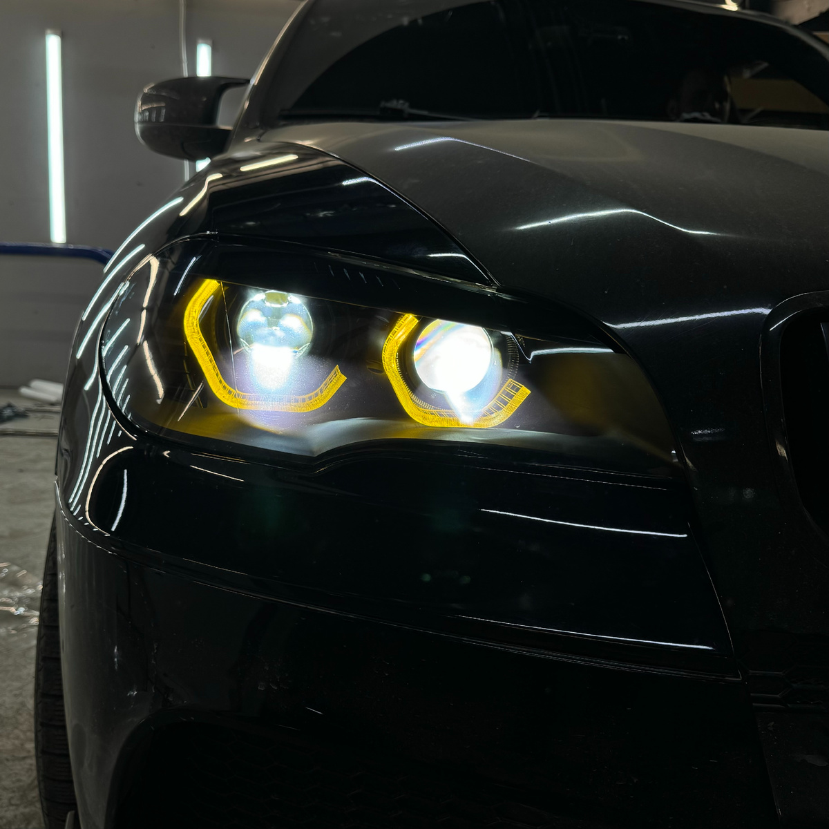 Установка 4-х линз. Квадро Bi-led BMW X5 E70. Установка лимонных ангельских глазок.