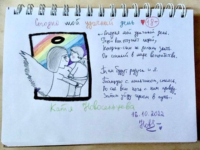Сегодня мой удачный день Сегодня мой удачный день. Герой добром кошмары все Убил навек. Я не боюсь. У сына сей во сне салют: Он видит свет, глаза мои. Морщины прЕдали тот вид, Что помнит он. Уже не та, Дороги к дому не сыскать. Осталась где-то далеко. Ушла за хлебом на денёк. Потом на два, на три, на год. Батон пропал, забыт, засох. И я замолкла навсегда. Слиняла, мраморно в экран Смотря последние часы: Со взглядом светлым бегал сын. И вот, окончен жизни путь. И нож вонзает милый друг. И сердце сжалось навсегда... Сидела я, смотря в экран. Не рад родной мой друг смертям. Держал за голову меня. Он издевался, как умел: Он бил, играл и ждал у стен, Пока покинет жизнь других. В подарок лилии купил. Их положил на женский труп. И громко хныкал мерзкий друг. Сегодня мой удачный день! Герой всех отпугнёт людей, Которых сын не должен знать. Он сонный в мире волшебства. Там будут радуга и я. Танцую с мальчиком, смеясь. Во сне всю ночь с ним проведу. Затем уйду героем в путь… 16.10.2022