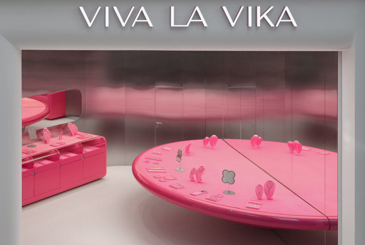 Площадь нового пространства Viva La Vika — 38 квадратных метров. Над дизайном проекта работало архитектурное бюро Kidz. Интерьер магазина отличает стилистика футуризма: сюрреалистические формы, глянцевые поверхности и фирменный розовый цвет. Ключевым элементом стали массивные тумбы, имитирующие застывшие волны. Для создания дополнительного акцента в металлические панели интегрированы светящиеся лайтбоксы в форме цветка Viva La Vika.