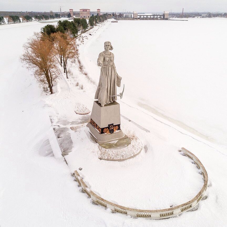 А вы знали, что у Волги в Рыбинске есть собственный монумент — и не где-нибудь на центральной площади, а на закрытой территории Рыбинской ГЭС. Этот памятник, получивший название «Мать-Волга», стал неофициальным символом города и всей великой реки, но увидеть его вблизи можно только зимой по льду или с берега посёлка Переборы — летом путь преграждён охраняемой зоной гидроузла. Монумент появился в 1953 году, когда завершалось строительство Рыбинской ГЭС и формировалось Рыбинское водохранилище — грандиозных инженерных сооружений, изменивших облик и судьбу региона. Идея увековечить трудовой подвиг строителей гидроузла возникла ещё в 1940-х годах. Интересно, что изначально на этом месте планировали установить другую скульптуру — знаменитую композицию Веры Мухиной «Рабочий и колхозница», ту самую, что стала символом «Мосфильма» и советской эпохи. Однако в итоге на песчаной косе шлюзов появилась «Мать-Волга» — статная женщина с русским лицом и косами, держащая в руках чертежи и приветствующа