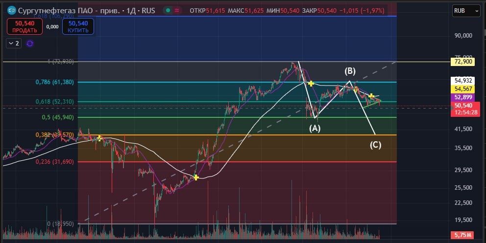 $SNGSP 🕯Я предполагаю, что строим три коррекционных волны, Об этом я писала в предыдущем разборе здесь . 🔽В данный момент цена вышла из треугольника вниз, когда пробил уровень 52,170 и идёт отрабатывать треугольник. ✅Промежуточный уровень поддержки 50,1, как только пробьёт, скорее всего, пойдёт к уровню поддержки до 46. 🤓 Наблюдаем за ситуацией, открывать позицию в Лонг сейчас рано, так как у нас основное движение нисходящее. НЕ ИИР #теханализ #трейдер #сургутнефтегаз #инвестиции