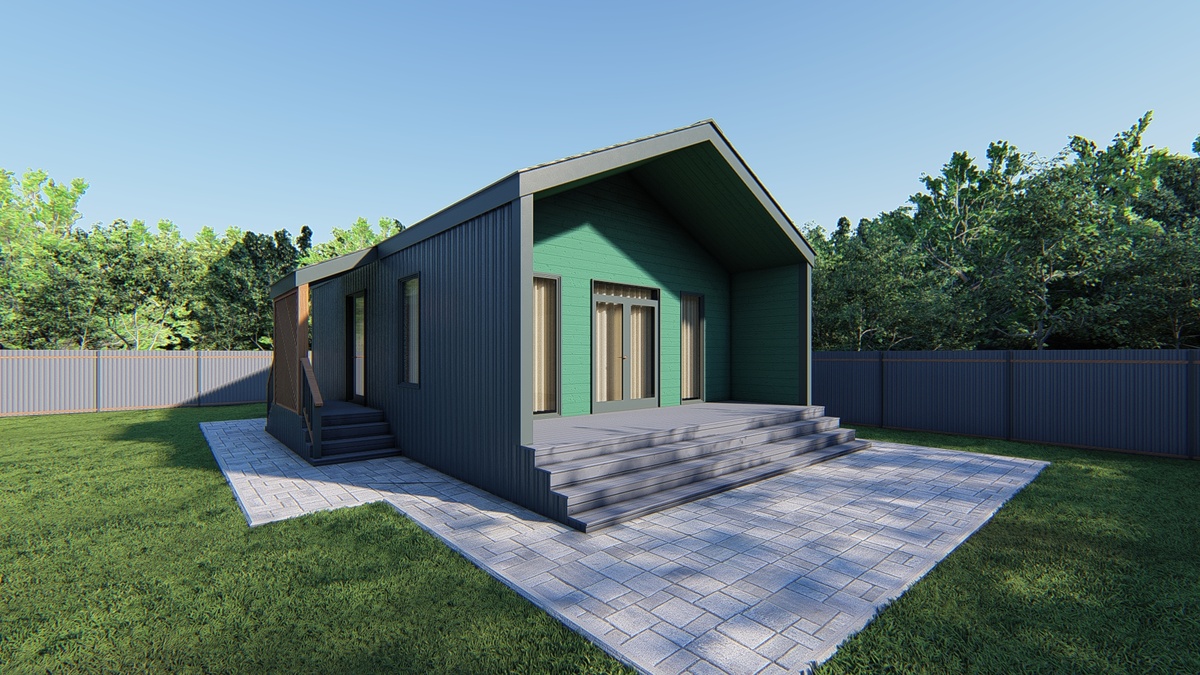 Проект дома в стиле барнхаус с акцентным зелёным цветом на торцах - современное решение для тех, кто ценит стиль и оригинальность. Такой дом идеально вписывается в природный ландшафт, создавая атмосферу гармонии. Дом площадью 72,18м² комфортно и эргономично организован. Входная зона представлена крыльцом (3,58м²) и тамбуром (3,70м²), что помогает сохранить тепло и чистоту в доме. Центральной частью является кухня-гостиная площадью 29м², условно разделённая на две функциональные зоны: зона приготовления и приёма пищи, а также зона отдыха, откуда можно выйти на просторную террасу площадью 12м². Это отличное место для встреч с семьёй и друзьями на свежем воздухе. В другом крыле расположены две уютные спальни по 10м² каждая, а также санузел (3,7 м²), размещённый удобно рядом с зонами отдыха. Такая планировка обеспечивает приватность и удобство для всех жителей. Выбор зеленого акцента не случаен. Он подчеркивает экологичность проекта и стремление к гармонии с природой. Такой дом будет выгл