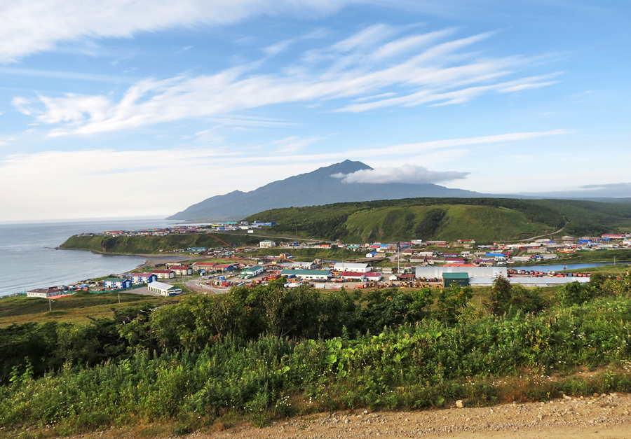 Вулканы Баранского (1134м), Иван Грозный (1158м) и Тебенькова (1212м) окружают Курильск со всех сторон, защищая от холодных ветров с открытого Тихого океана. Поэтому даже во время тайфунов тут относительно сухо и тепло.