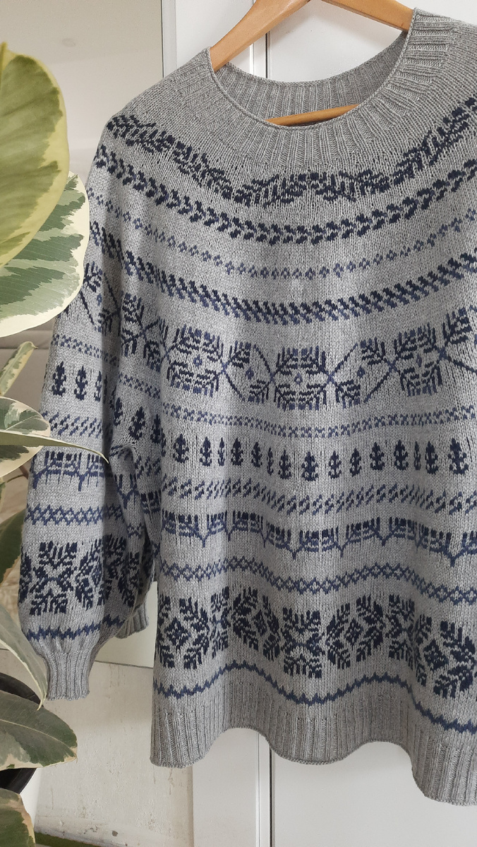 Добрый день, друзья! Ох и досталось мне это счастье... Красавчик, правда ведь? Да и он же долговяз, потому что спицами мне вязать некогда!!! А ведь у меня ещё есть экземпляр долгосрочного вязания на спицах.... (работаю над ним! Или надо мной?))) Ох как же они тянут за душу.... Размер большой, условно вязала по описанию, фактически использовала только схемы и их последовательность, т.к нужно было увеличивать размер, а значит добавлять в окружности ещё один самый большой раппорт жаккарда, он вроде на 80 петель... А в последствии ещё оказалось, что рукава коротковаты... нет слов... по измерениям должно было быть нормально! И что с этим всем делать? А пряжа то была ещё значительно тоньше, чем в описании.. использовали 550м/100гр, спицы 3, меринос 70%, шелк 30%, какая то известная, все одно время за ней гонялись, но я такую не покупала.... вроде артикул Сильвер... кому интересно загуглите, а у меня нет на это времени и записей под рукой! Вспомнить бы ещё вес .... по-моему 500гр или 550 гр,